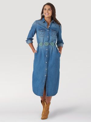 Women S Wrangler Retro Long Sleeve Denim Midi Dress Women S Dresses Jumpsuits Wrangler